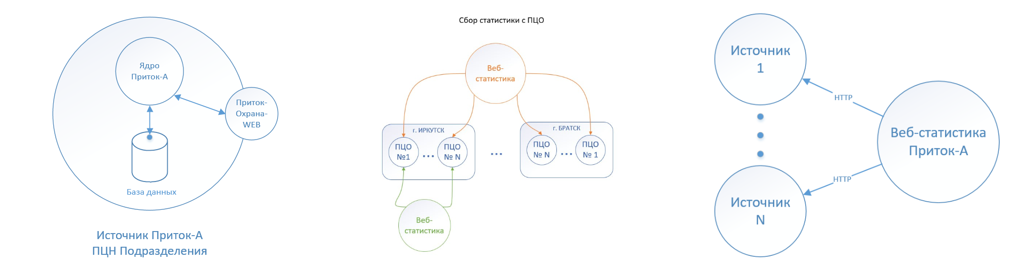 Для получения информации «Веб-статистика» взаимодействует с приложением «Приток-Охрана-WEB», которое должно быть развёрнуто в каждом подразделении. Обмен данными происходит по защищенному протоколу HTTP/HTTPS.