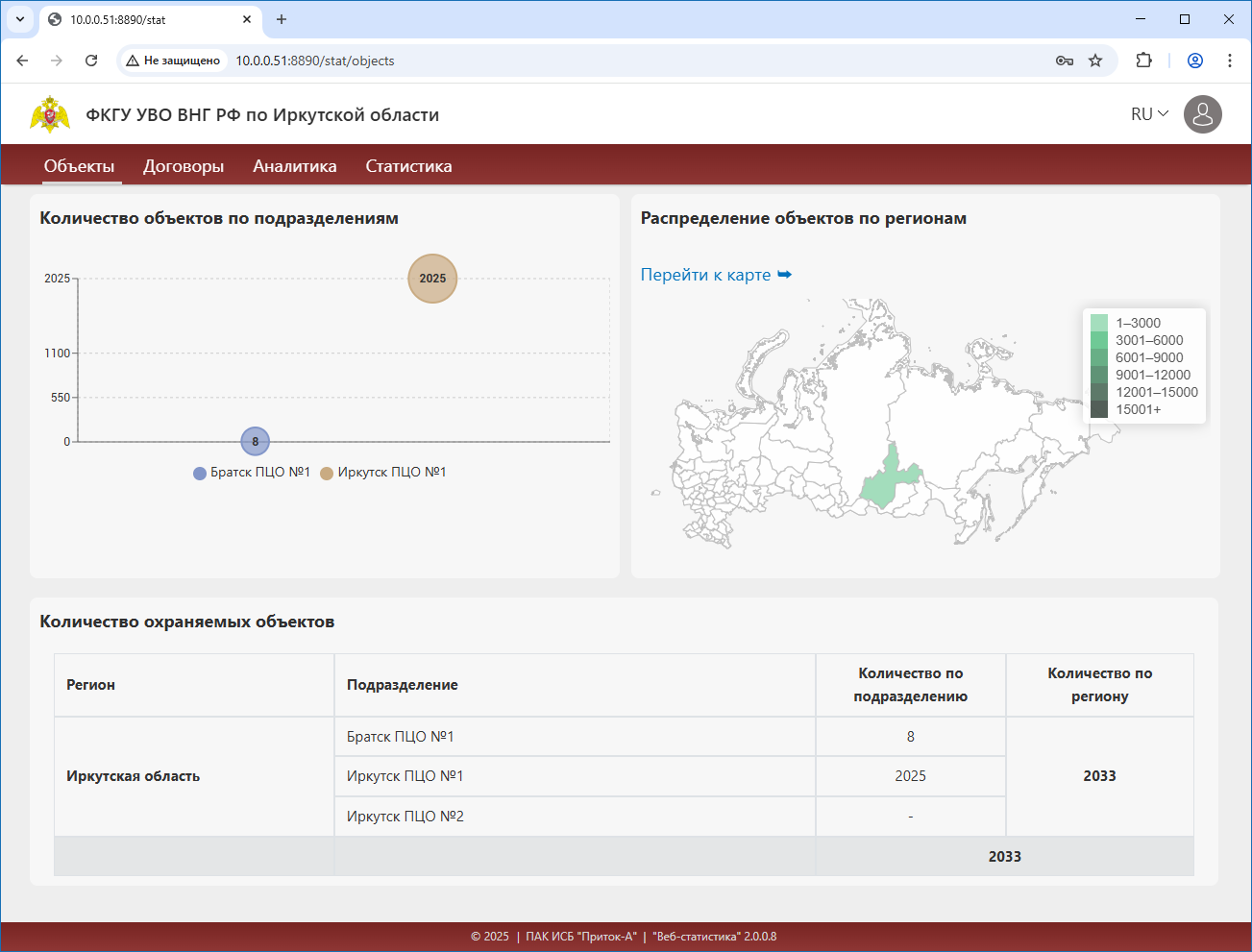 По объектам: диаграмма и таблица с распределением охраняемых объектов по подразделениям, а также отображение объектов на графической схеме и карте местности (с учётом регионов подразделений).