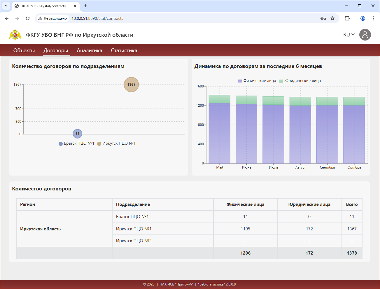 По договорам: количество договоров по подразделениям с разделением на физических и юридических лиц (в виде диаграммы и таблицы), а также график изменения количества заключённых договоров за последние 6 месяцев.