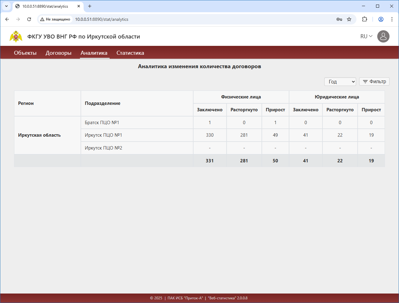 В разделе «Аналитика»: таблица с количеством заключённых и расторгнутых договоров по каждому подразделению за указанный период. При выборе строки открывается детальный список объектов с изменениями.