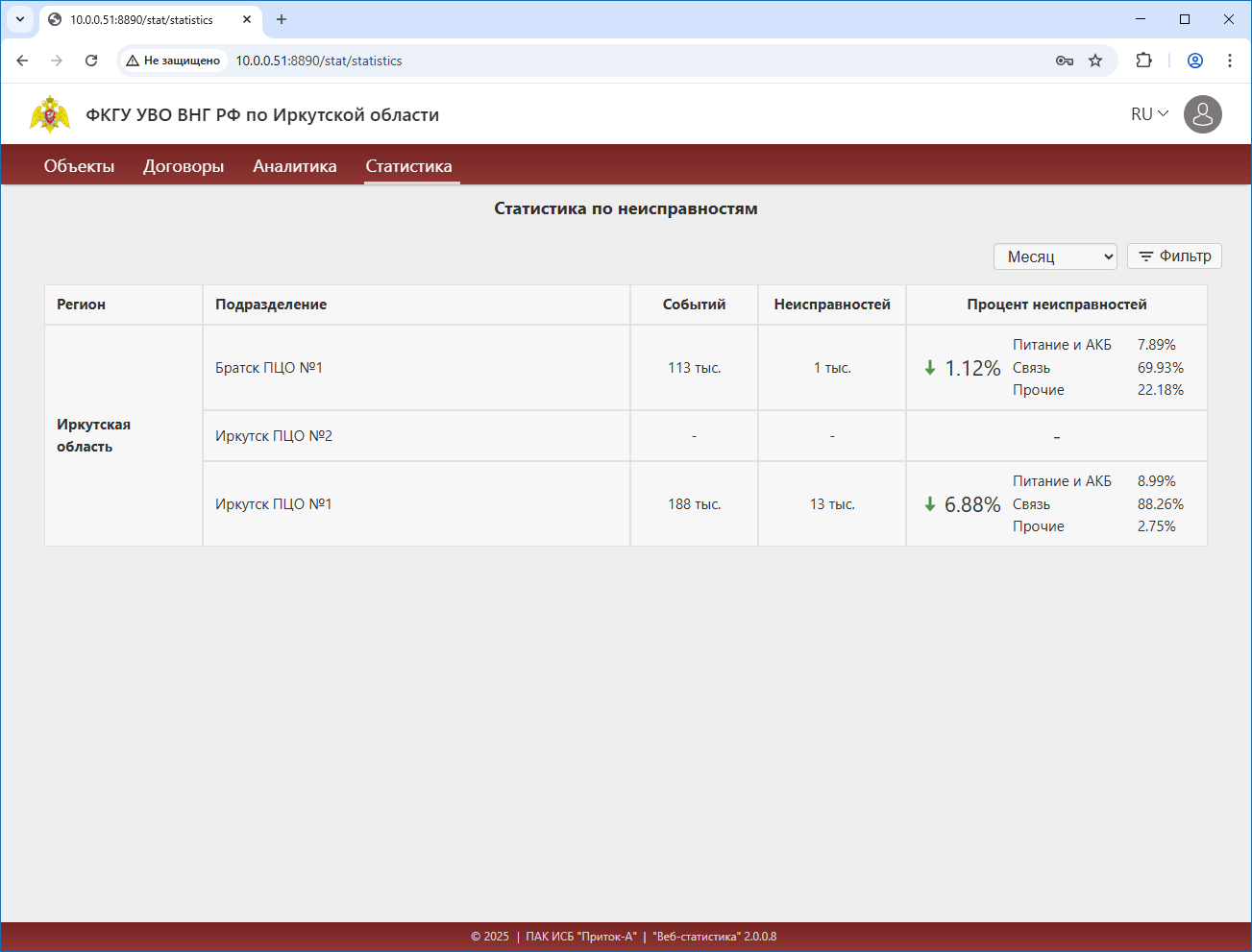 «Веб-статистика» - веб-приложение из состава ПАК ИСБ «Приток-А», которое предназначено для сбора и анализа информации с пультов централизованного наблюдения (далее – ПЦН) подразделений Вневедомственной Охраны Росгвардии РФ. Приложение помогает руководителям инженерно-технических служб и руководителям подразделений различного уровня просматривать и анализировать собранную информацию в виде отчетов, таблиц, графиков, диаграмм.