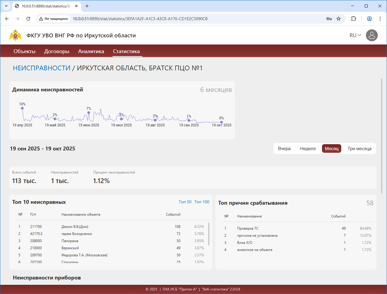 В разделе «Статистика»: таблица с процентом неисправностей и динамикой изменений по каждому подразделению. При детализации доступны: