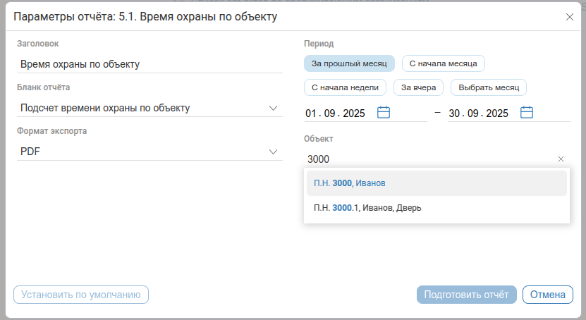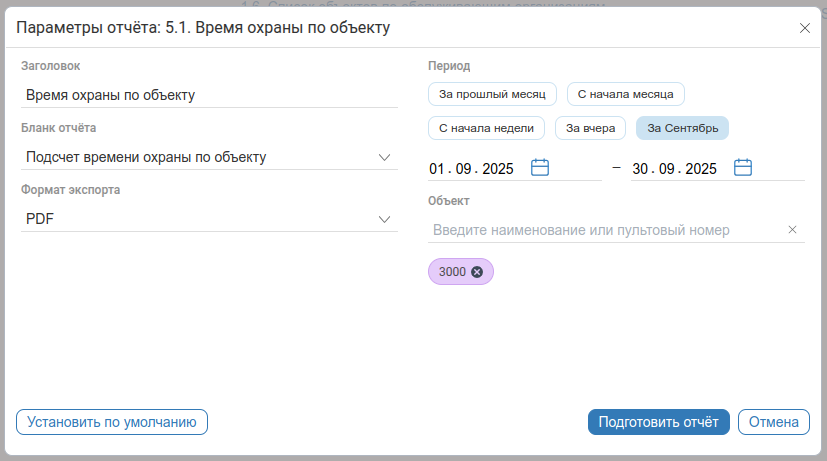 Для подготовки отчёта необходимо указать период и пультовый номер зоны/шлейфа, по которому будет выполнен расчёт времени охраны.
