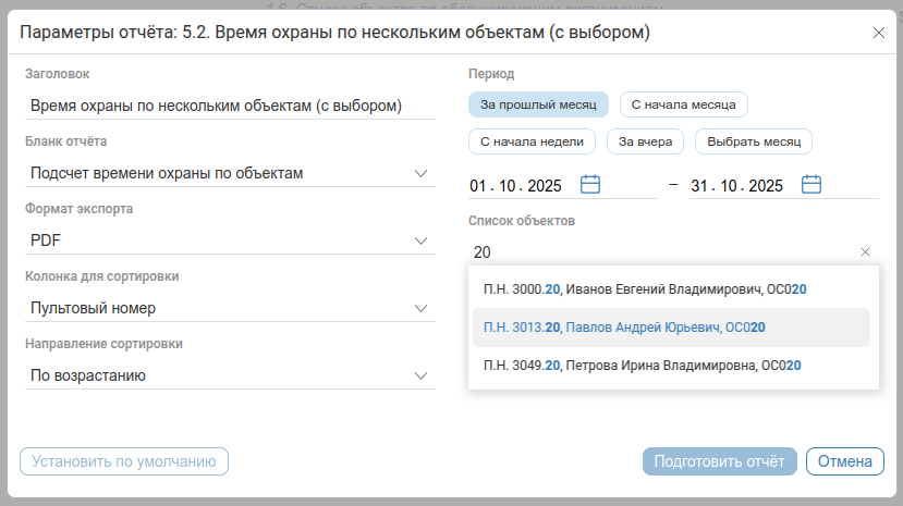 «5.2 Время охраны по нескольким объектам (с выбором)»