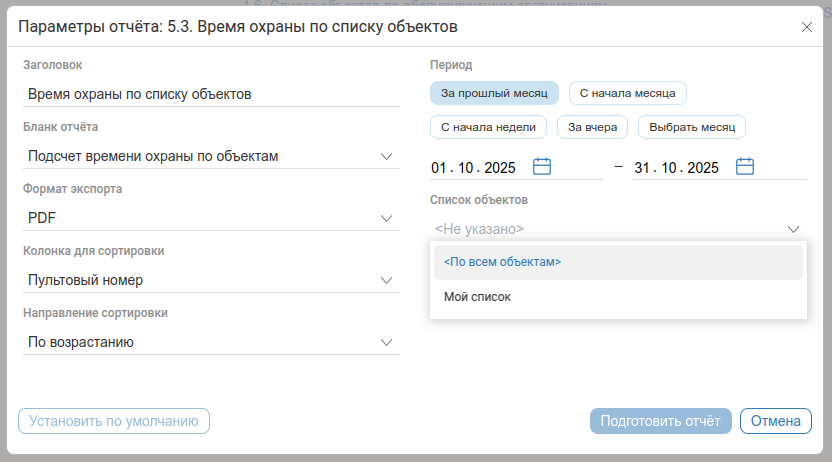 Кроме списков, созданных пользователем, в системе присутствует системный список «<По всем объектам>», который формируется автоматически. Такой список тоже можно выбрать при подготовке отчёта 5.3.